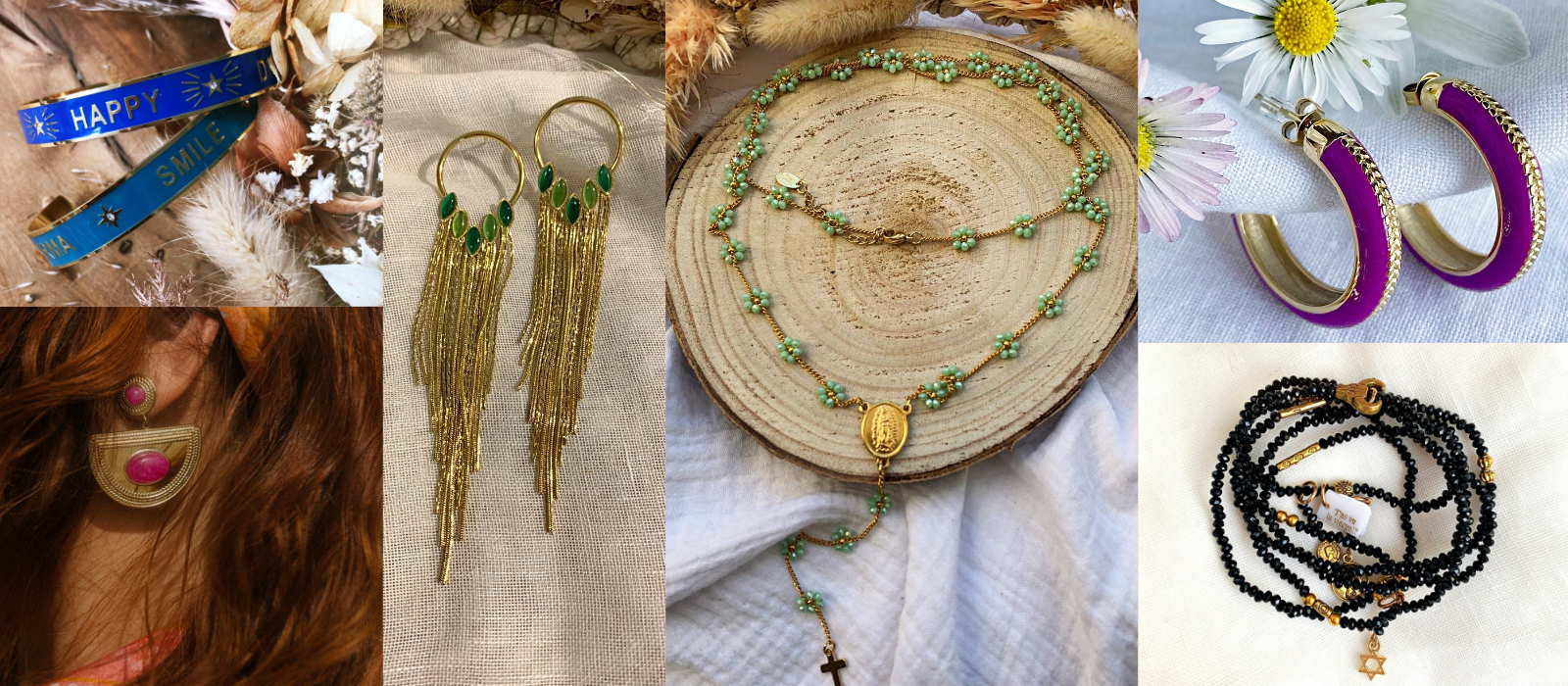 Les bijoux bohèmes sont souvent fabriqués avec des pierres, des coquillages, des perles, des plumes, des métaux dorés, et peuvent être ornés de motifs ethniques, de symboles mystiques ou de détails gravés.